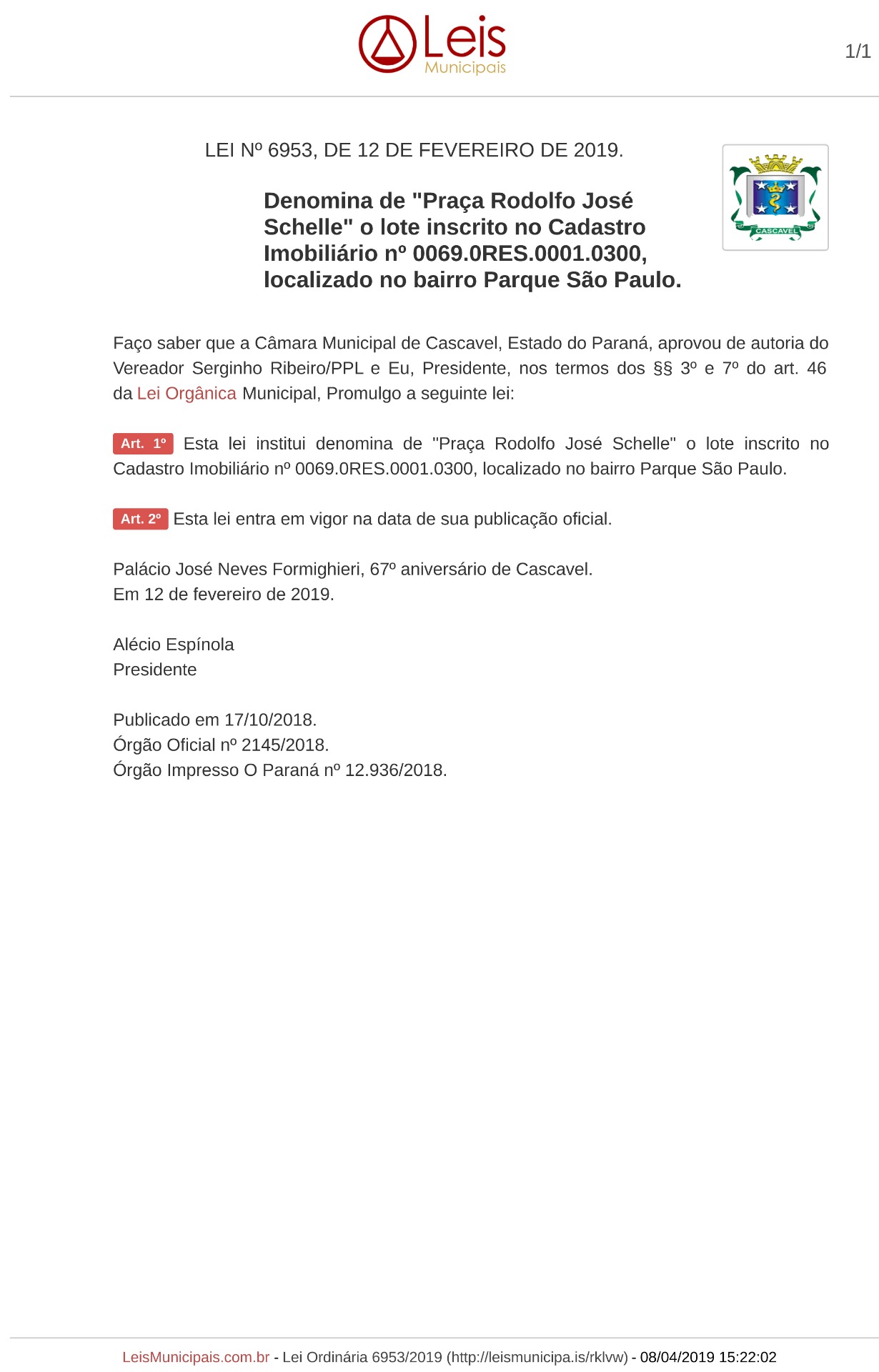 Lei de autoria do Vereador Serginho Ribeiro, Denomina de "Praça Rodolfo José Schelle" o lote inscrito no Cad. Imob. nº 0069.0RES.0001.0300, localizado no bairro Parque São Paulo