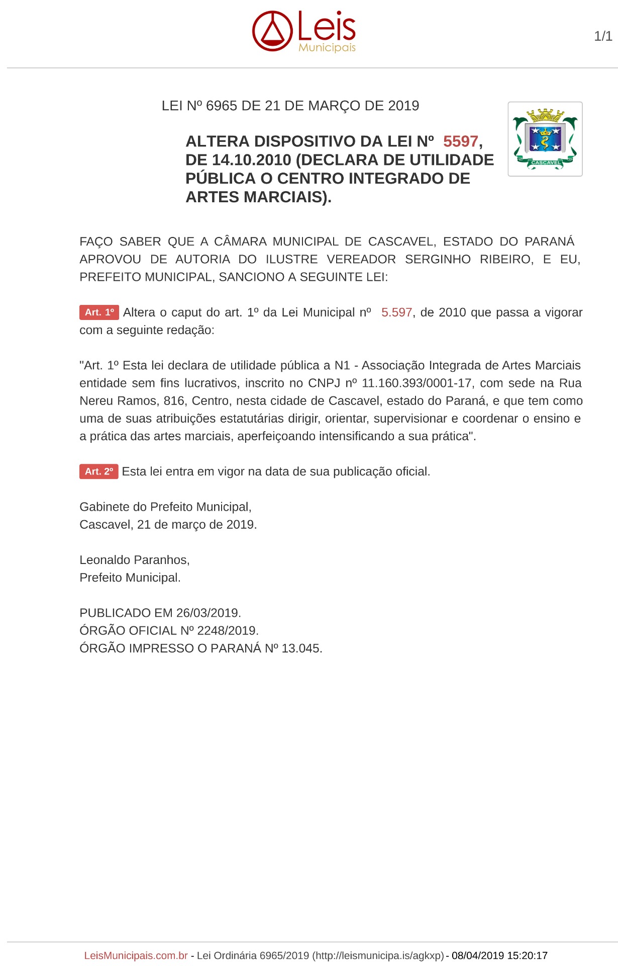 Lei de autoria do Vereador Serginho Ribeiro Altera Dispositivo da Lei nº 5597, (14/10/2010) – Declara Utilidade Pública o Centro Integrado de Artes Marciais N1